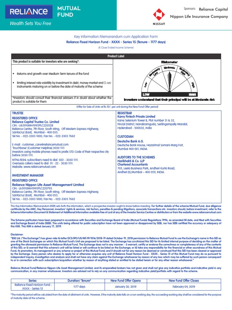 Kim Cum Appln Form Reliance Fixed Horizon Fund Xxxx Series 15 Pdf Repurchase Agreement Securitization